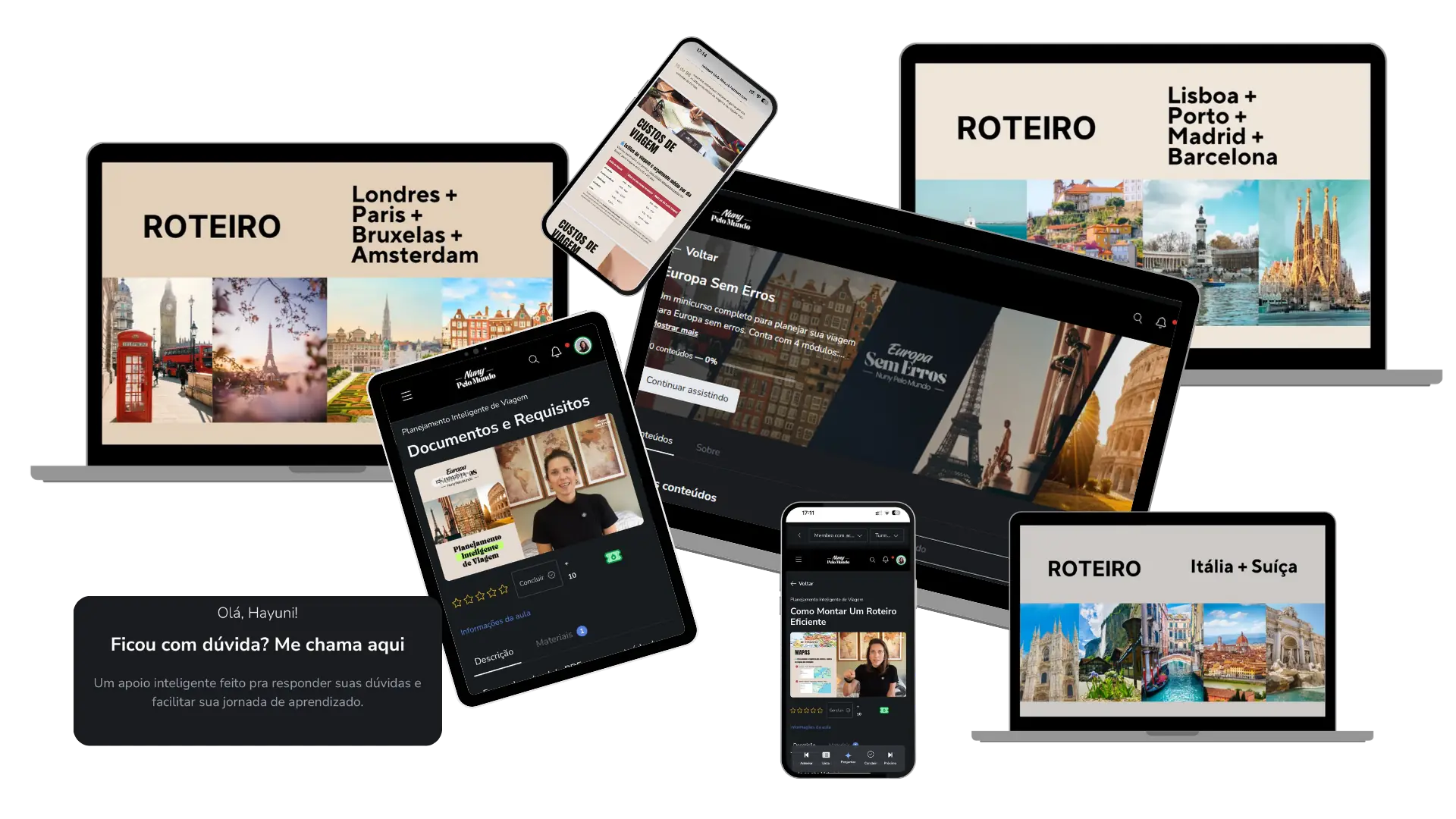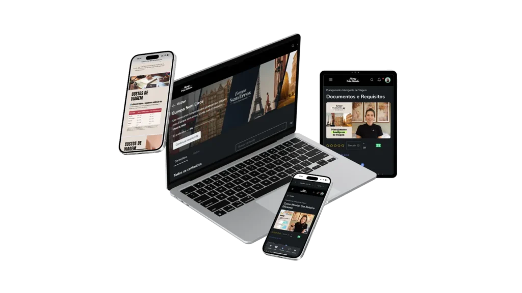 Você aprende no seu ritmo, sem enrolação, e pode acompanhar tudo pelo celular, tablet ou computador — estilo Netflix de viagens.